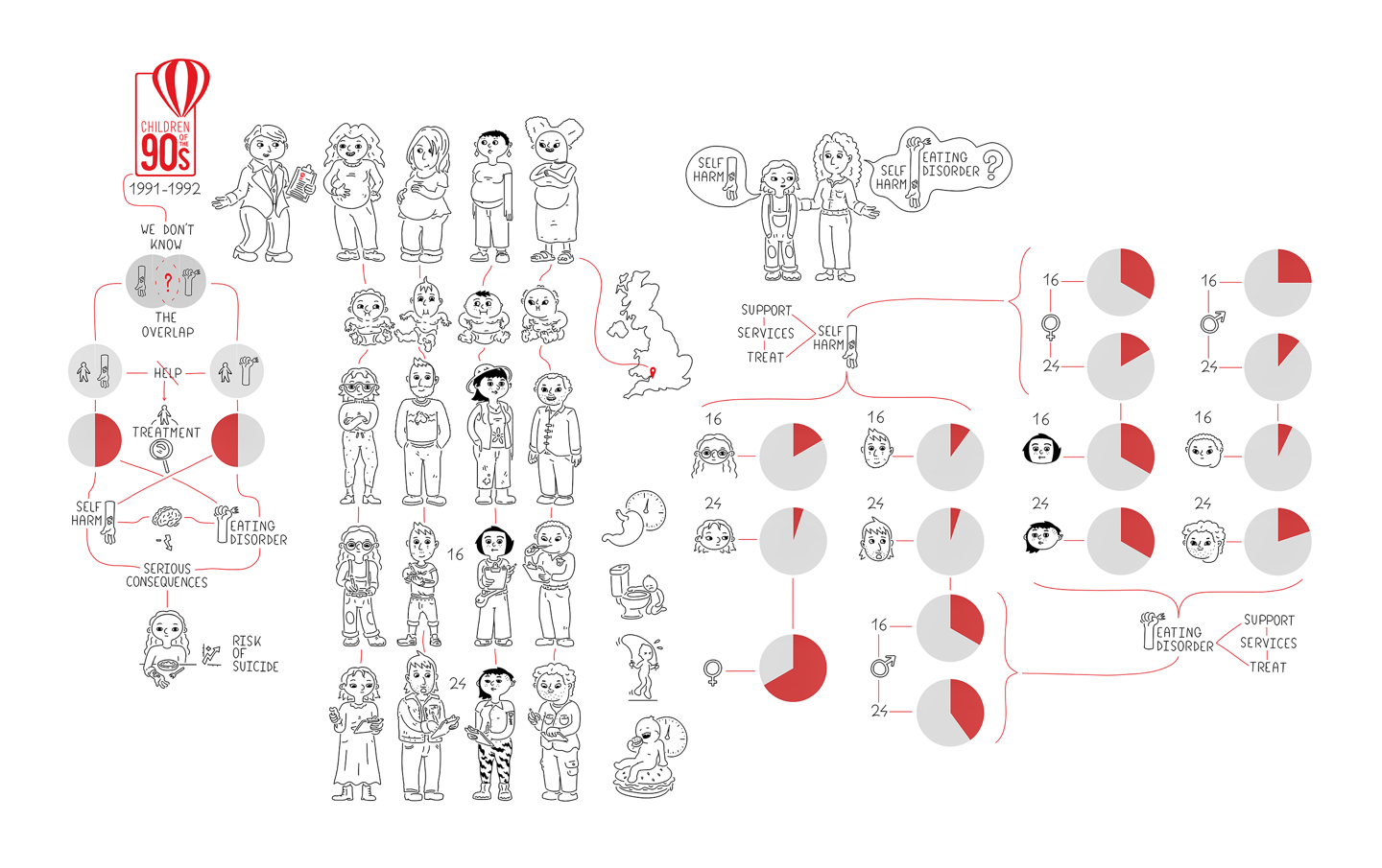 This infographic explores the overlap between self-harm and eating disorders within the "Children of the 90s" UK cohort study, highlighting how these behaviors manifest differently by age and gender.