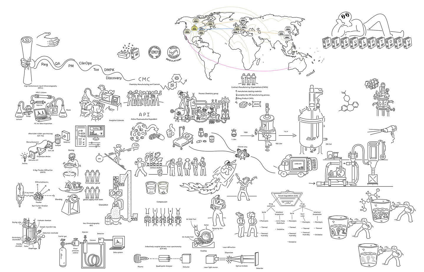 Chemistry Manufacturing and Controls (CMC) ensures safe production of Active Pharmaceutical Ingredients (APIs) and their transformation into final Drug Products for patient use. This process involves collaboration across chemistry, analytical sciences, formulation, and global manufacturing to meet strict regulatory standards.