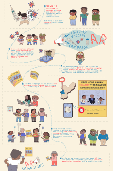 This infographic highlights a collaborative campaign in West Philadelphia using Augmented Reality (AR) to engage African American families, aiming to boost pediatric COVID-19 vaccination rates through accessible, culturally resonant materials.